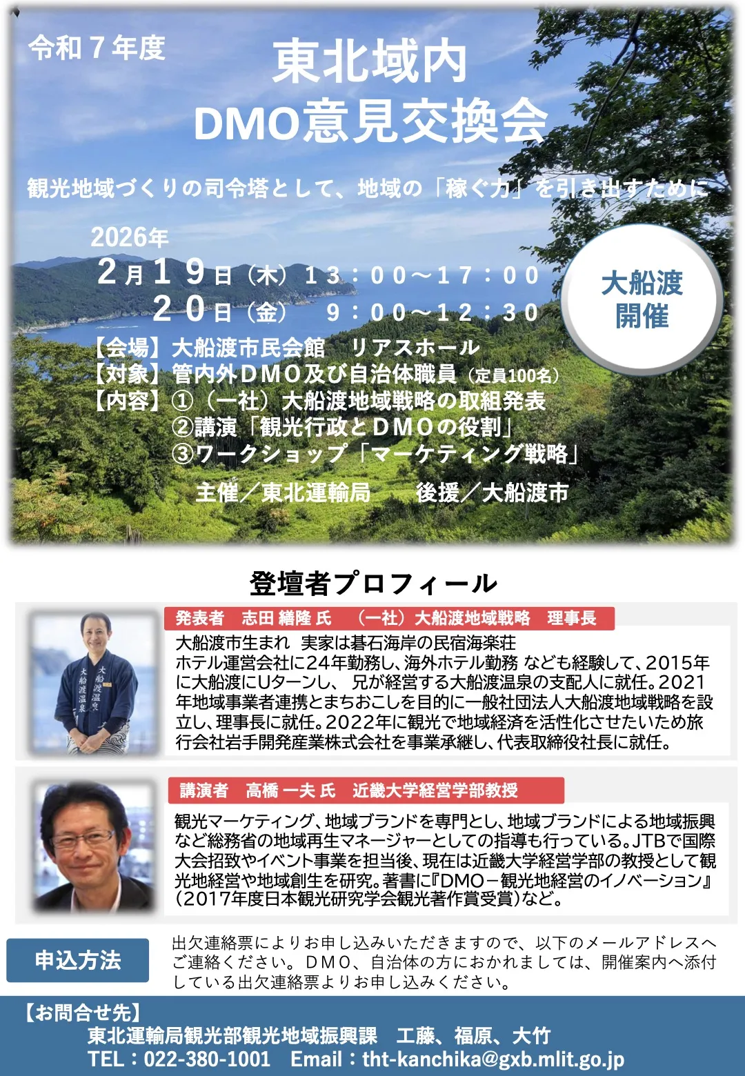 令和8年2月19日(木)・20日(金)の2日間、大船渡市民文化会館リアスホールにて 「令和7年度 東北域内DMO意見交換会」が開催されます。