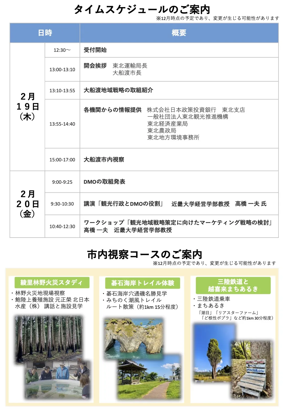 当法人からは理事長の志田繕隆が登壇し、大船渡地域戦略の取組についての発表を行います。 また、近畿大学経営学部教授の高橋一夫氏による講演「観光行政とDMOの役割」や、 マーケティング戦略をテーマとしたワークショップも実施されます。